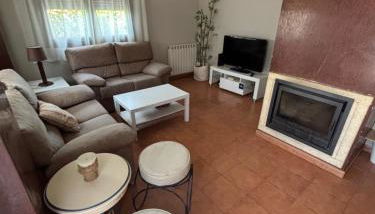 La casa o chalet cuenta con 4 dormitorios, 3 baños, ropa de cama, toallas, TV de pantalla plana, zona de comedor, cocina totalmente equipada y terraza con vistas al jardín.
