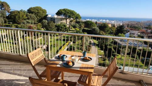 Stunning views large balcony apartment with pool, que tiene vistas al mar, dispone de alojamiento con balcón y cafetera, y está a unos 12 km de Palacio de Festivales de Cannes. Este alojamiento con aire acondicionado está a 1,9 km de Playa de Fort Carré y ofrece wifi gratis y parking privado en el propio alojamiento.