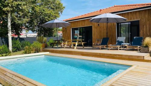 Cabane De Brice in Ares with pool está en Arès, a 11 min a pie de Plage Saint-Brice y a 36 km de La Coccinelle, y ofrece alojamiento con wifi gratis, aire acondicionado, piscina al aire libre y terraza.