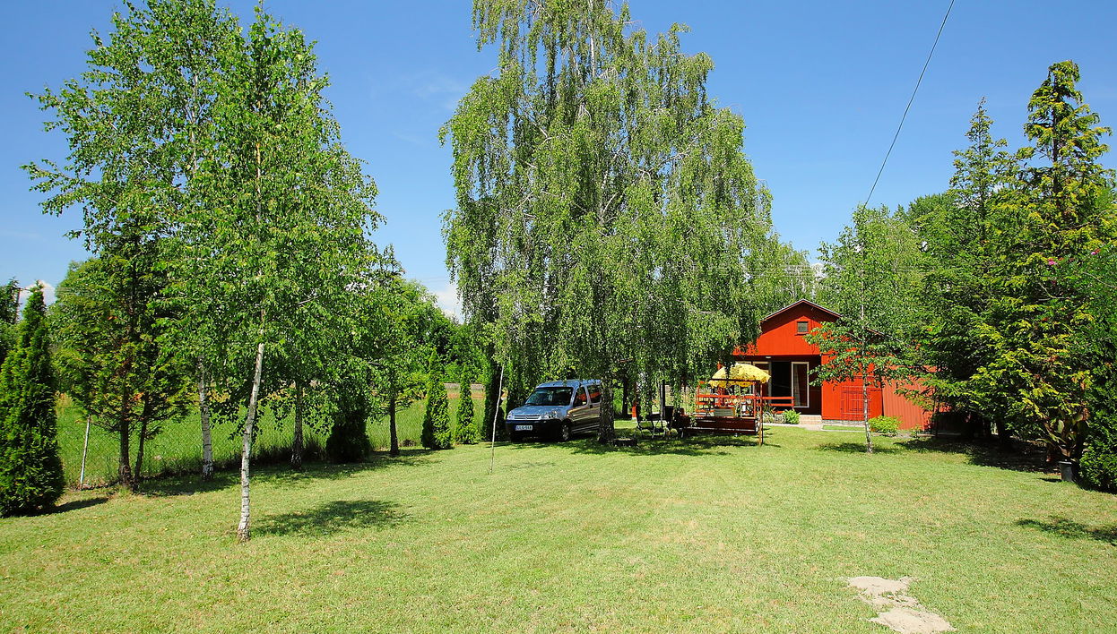 Balatomáriafürdő: Casa de madera "Rosso", sencilla. Lugar soleado, a 400 m de un lago. Privado: jardín 500 m2 (vallado), terreno con hierba. Tienda de comestibles 450 m, restaurante 300 m, playa de césped 400 m. A tener en cuenta: vías del tren en la proximidad.