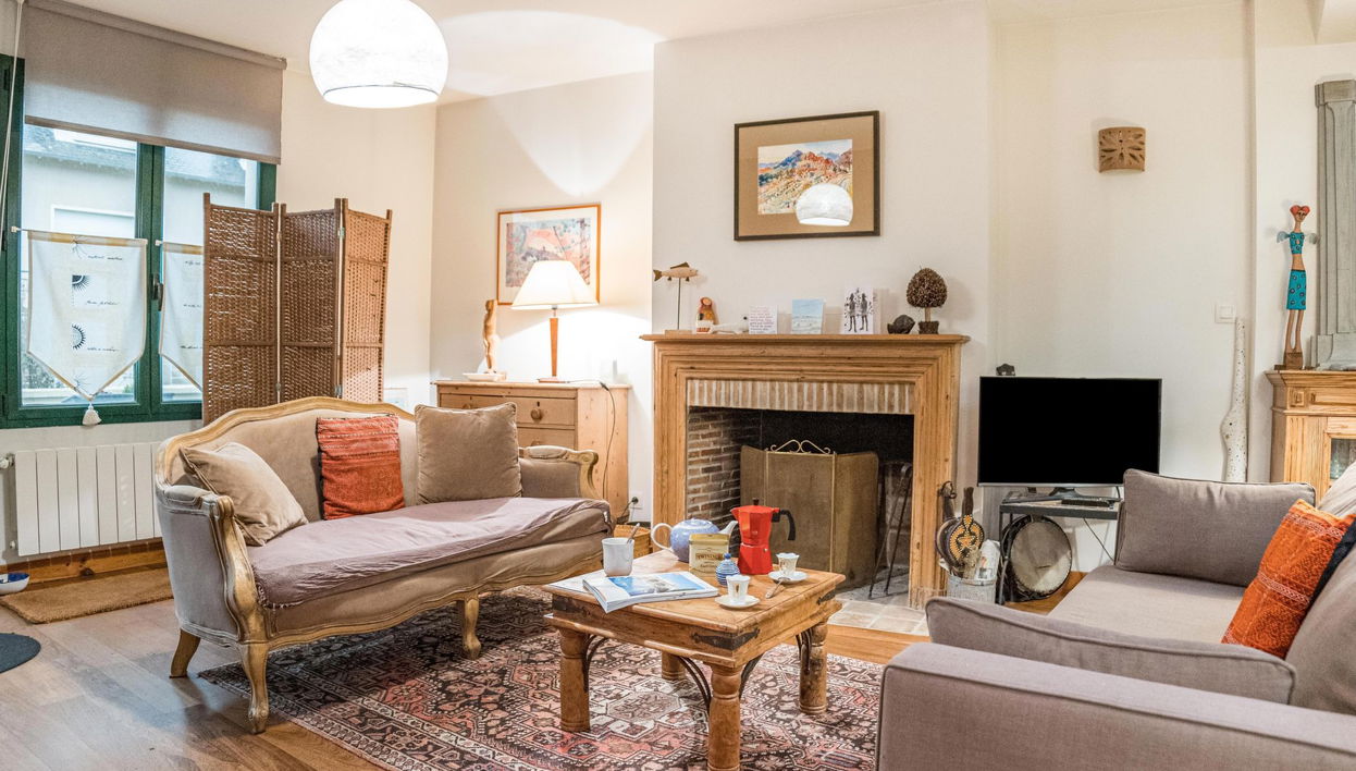 "Camélia", casa adosada 3 estancias 80 m2 en 2 plantas. Espacioso y luminoso, completamente reformada, con mobiliario confortable y de buen gusto: salón-comedor grande con chimenea (sólo con función decorativa), TV (pantalla plana). Salida al jardín.