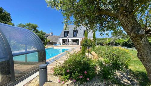 Superbe Villa à 200m de la plage tout confort avec piscine chauffée, couverte et spa está a 4 min a pie de Plage de Maner Coat Clevarec y dispone de alojamiento en Fouesnant con acceso a una piscina de temporada al aire libre, wifi gratis y servicio de conserjería. Esta villa tiene piscina privada, jardín y parking privado gratis.