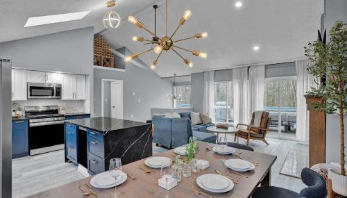 Pocono Blue with Paddleboards, Spa, Indoor Jacuzzi, GameRoom, Lake, EV, que tiene zona de playa privada, terraza y restaurante, ofrece alojamiento en Gouldsboro con wifi gratis y vistas a la montaña. La casa o chalet, que cuenta con parking privado gratis, está en una zona en la que se pueden practicar actividades como esquí, pesca y piragüismo.