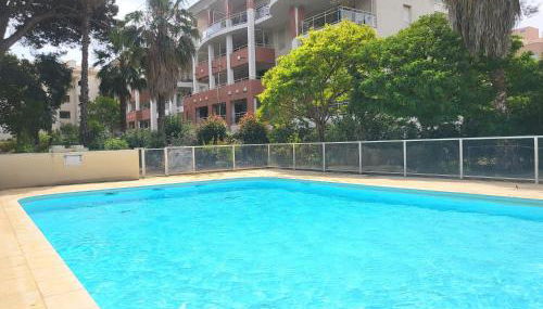 T3, vue mer, piscine, garage, que tiene piscina de temporada al aire libre, jardín y terraza, dispone de alojamiento en Hyères con wifi gratis y vistas al mar. Este alojamiento ofrece parking privado gratis y acceso a un balcón.