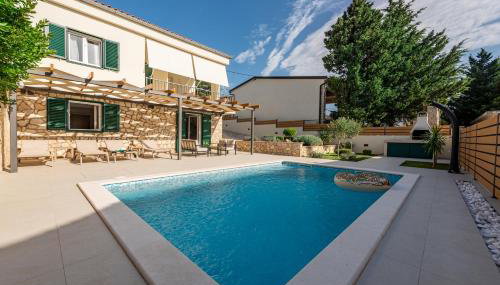 DALMOR holiday house, que está en Rovanjska, tiene aire acondicionado y ofrece alojamiento con patio. Esta villa tiene piscina privada, jardín, zona de barbacoa, wifi gratis y parking privado gratis.