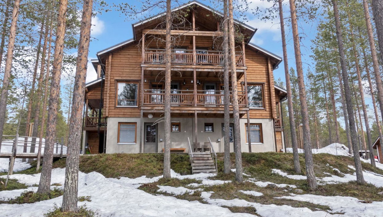 Amplio apartamento vacacional con capacidad para diez personas. Instalaciones en tres plantas. Amplia y ambientada choza para cocinar en el patio. Apartamento de madera en casa adosada situada en Levi, en la pista de esquí de Länsirinne.