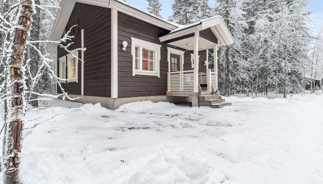 Cabaña de troncos independiente ubicada 40 km al norte de Kolari en la zona central del pueblo Äkäslompolo, construida en 2014. Salón-cocina, dos dormitorios cada uno con dos camas individuales, sauna eléctrica, baño, WC.