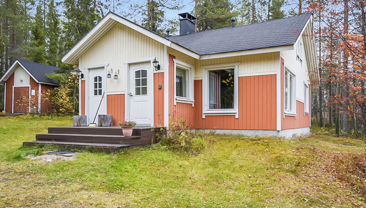 13 km al noreste de Kuusamo, Ruka a 30 km, el lago Saapunkijärvi a 50 m, playa de fondo arenoso, profunda después de 3-4 m, bote de remos, muelle.