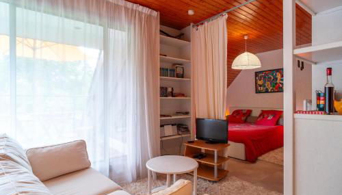 El apartamento cuenta con terraza y vistas al jardín, y tiene 1 dormitorio, una sala de estar, TV, una cocina equipada con nevera y lavavajillas, y 1 baño con ducha. Hay toallas y ropa de cama en el apartamento.