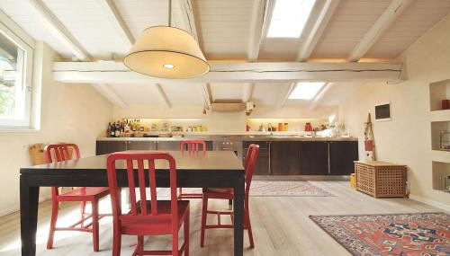 Spacious Accommodation: Design loft ski in ski out in La Thuile offers a spacious chalet with three bedrooms and two bathrooms. The living room features a balcony with mountain views, a fully equipped kitchen, and a dining area.