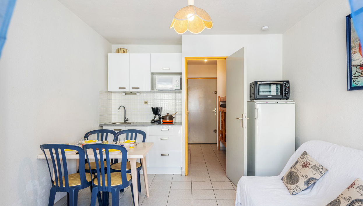 Estudio 25 m2 en el 2° piso. Vivienda adecuada para 2 adultos + 2 niños. Salón-comedor con 1 sofá-cama doble (140 cm, 190 cm de longitud), TV (pantalla plana). Salida a la terraza. Entrada con 1 x 2 literas (70 cm, 190 cm de longitud). Rincón-cocina (2 fogones, horno pequeño, microondas). Ducha, WC separado. Calefacción. Terraza 4 m2, orientación este. Muebles de terraza. El alojamiento dispone de: Internet (Wifi, extra). A tener en cuenta: sin aparcamiento. Permitido máximo 1 mascota / perro. Detector de humo, sin ascensor. FR6615.120.4