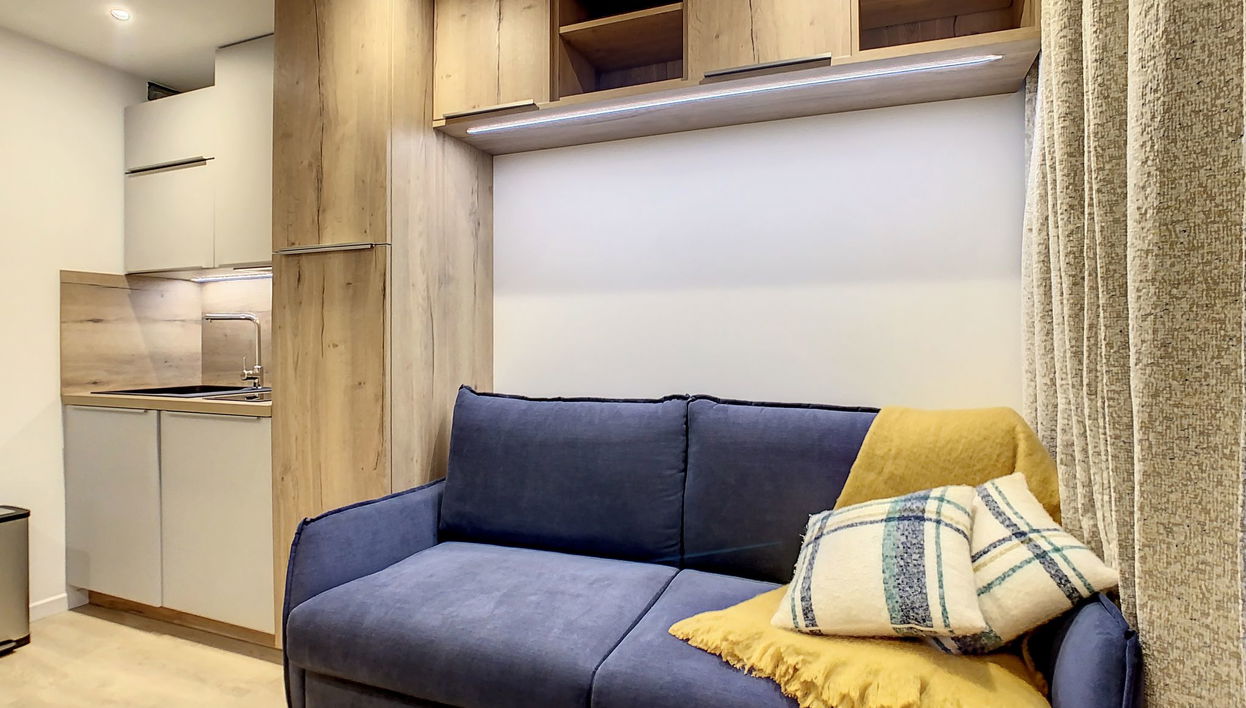 "Chavière 716" estudio 24 m2 en el 7° piso, orientación sur. Completamente reformado en 2022, con mobiliario bonito y moderno: salón-comedor con 1 sofá-cama doble (140 cm, 190 cm de longitud), TV (pantalla plana). Salida al balcón.