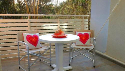 El apartamento cuenta con terraza y vistas al jardín, y tiene 1 dormitorio, una sala de estar, TV, una cocina equipada con nevera y fogones, y 1 baño con bidet.
