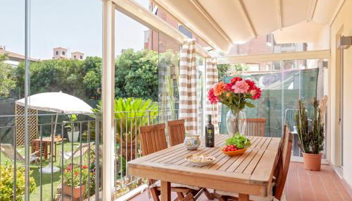 Este apartamento con aire acondicionado tiene acceso a una terraza con vistas al jardín y cuenta con 2 dormitorios y cocina totalmente equipada.