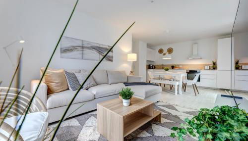 El apartamento cuenta con terraza y vistas al jardín, y dispone de 2 dormitorios, una sala de estar, TV, una cocina equipada con nevera y lavavajillas, y 2 baños con ducha.