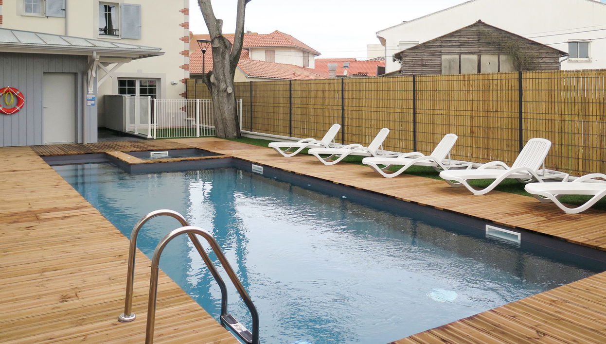 Resort "Le Marché de la Plage", pequeño de 4 plantas del año 2017. 37 apartamentos en la residencia. En el centro de Mimizan-Plage, a 6 km del centro de Mimizan-Bourg, a 70 km del centro de Arcachon, a 250 m del mar. Comunitario: piscina climatizada, vallada (9 x 4 m, 140 cm de profundidad, Disponible por temporada: 19.Abr. - 21.Sep.) con escalera interior. Ducha exterior, piscina de hidromasaje, terraza. En el complejo: recepción, acceso a internet, Wifi, gimnasio, ascensor, sala para guardar bicicleta, lavadora, secadora (uso comunitario, extra). Posibilidad: desayuno (extra). Garaje comunitario (extra), posibilidad de aparcamiento. Tienda, supermercado, restaurante 50 m, playa de arena 250 m. A tener en cuenta: La foto corresponde a una de las viviendas. Los alojamientos pueden diferir en la superficie habitable, la distribución de las estancias, el equipamiento y el mobiliario.