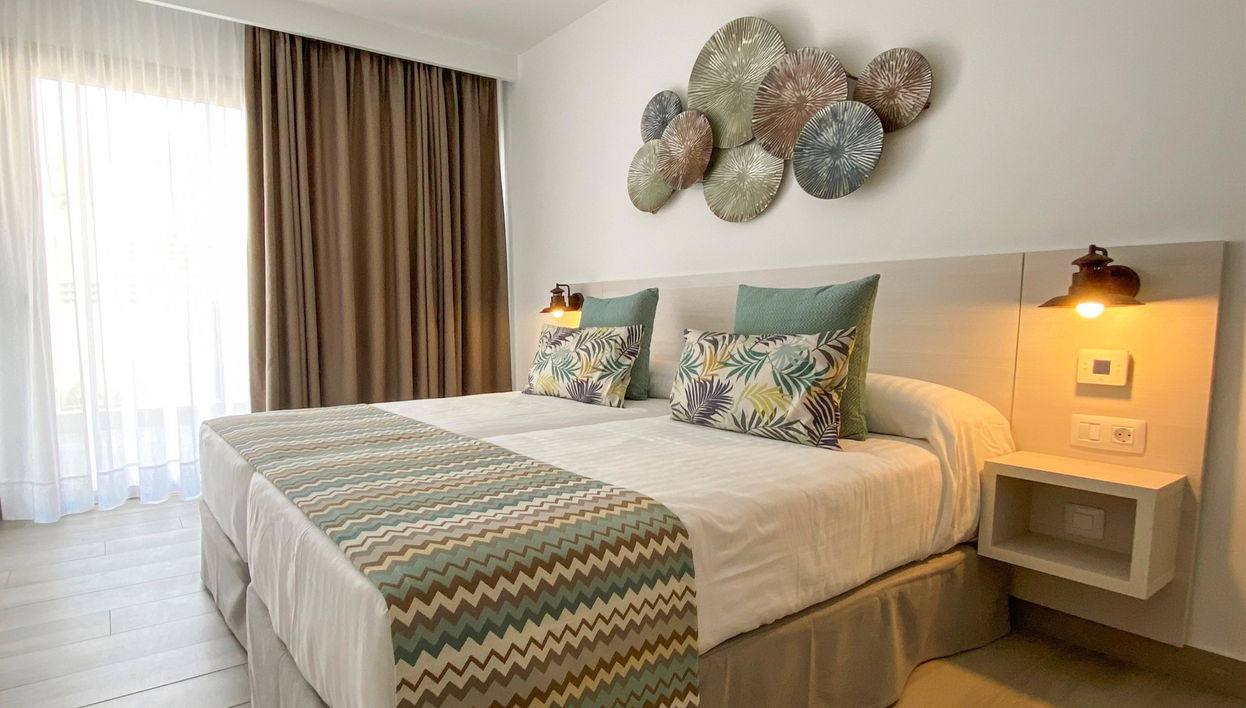 Cómodos y modernos apartamentos de un dormitorio con aire acondicionado, cocina, espacioso salón y grandes terrazas/balcones, además de una maravillosa piscina rodeada de un extenso solárium con hamacas y sombrillas.