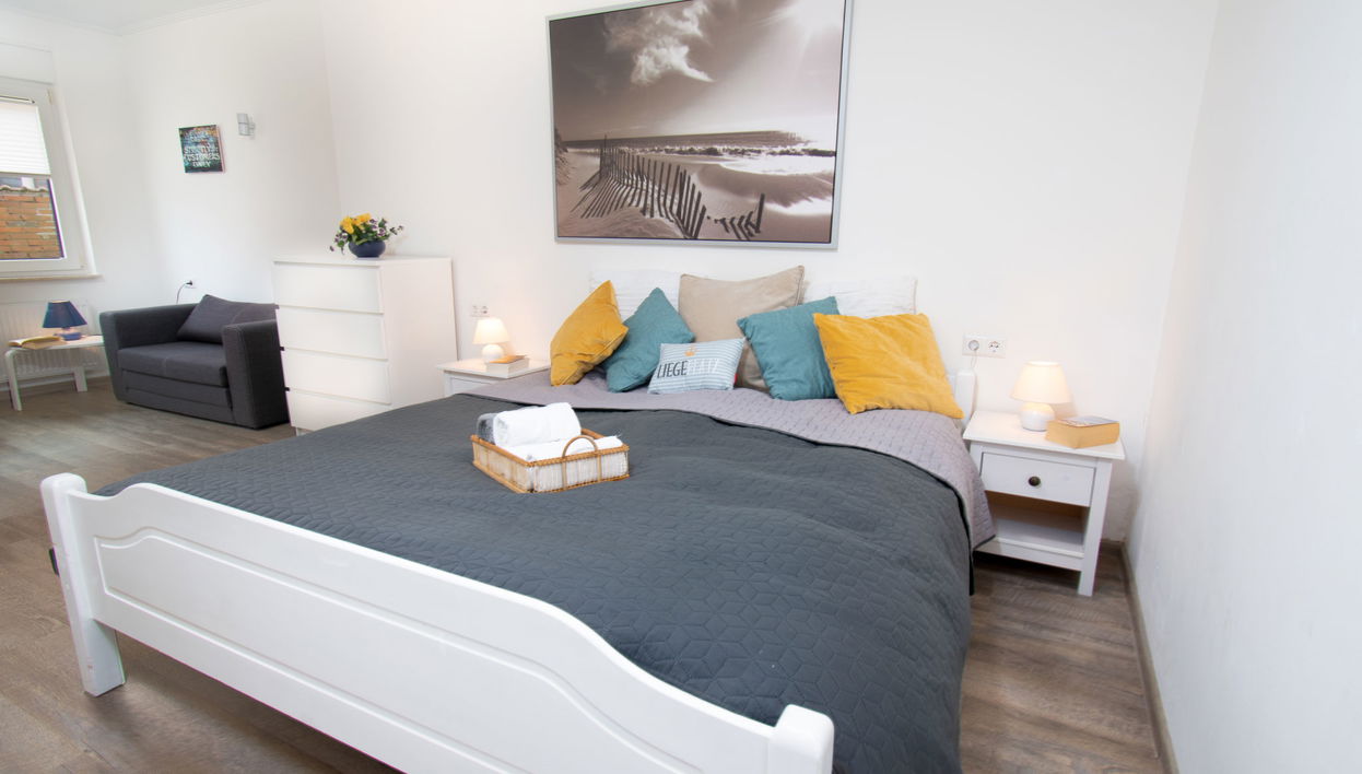 "Strandmuschel", apartamento de 3 estancias 56 m2, en la planta baja. Con mobiliario bonito y agradable: salón-comedor 22 m2 con TV satélite (pantalla plana), radio y CD. Salida al jardín, a la terraza. 1 dorm. 20 m2 con 1 cama doble (2 x 90 cm, 200 cm de longitud). 1 dorm. 6 m2 con 2 camas (90 cm, 200 cm de longitud). Pequeña cocina (2 placas de vitrocerámica, cafetera eléctrica, horno para pizza). Ducha/WC. Muebles de terraza, barbacoa (portátil). El alojamiento dispone de: trona (extra). A tener en cuenta: apartamento para no fumadores.