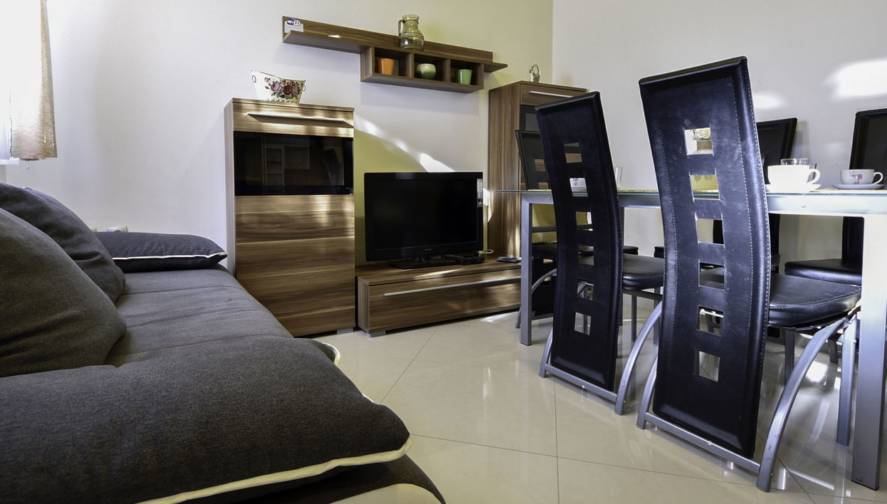 Apartamento de 3 estancias 60 m2, en la planta baja. Salón-comedor con TV satélite (pantalla plana), aire acondicionado. Salida a la terraza. 1 dorm. con 1 cama doble (2 x 80 cm, 200 cm de longitud). 1 dorm. con 2 camas (80 cm, 200 cm de longitud).