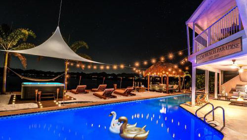 Waterfront Villa with Beach, Pool, Cinema, Game Room and Tiki está en Palm Beach Gardens y ofrece una terraza con vistas a la piscina y al río, además de piscina al aire libre abierta todo el año, sauna y bañera de hidromasaje. La villa, que tiene parking privado gratis, está en una zona en la que se pueden practicar actividades como pesca, piragüismo y billar.