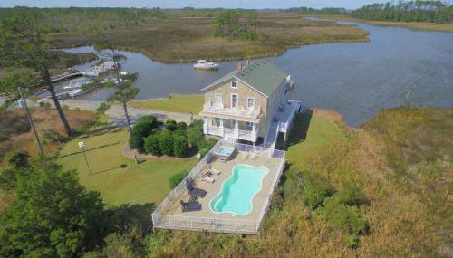Sawyers Lodge - Historic Soundfront Home, Pool, Hot Tub, Boat Launch, Kayaks, Pets OK, Flex Stays, que se encuentra en Powells Point, tiene aire acondicionado y ofrece alojamiento con piscina privada.