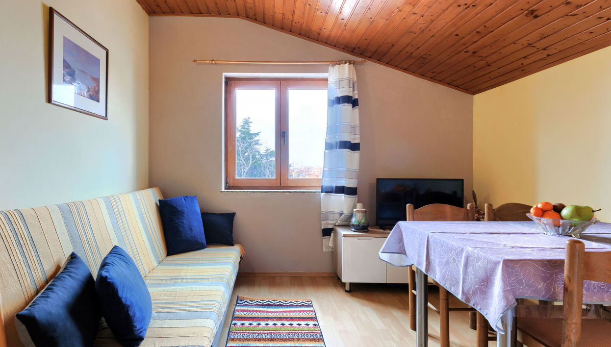 "Ruža 2", apartamento de 3 estancias 50 m2, en el ático. Salón-comedor con TV satélite y aire acondicionado. 1 dorm. con 2 camas. 1 dorm. con 1 x 2 literas.
