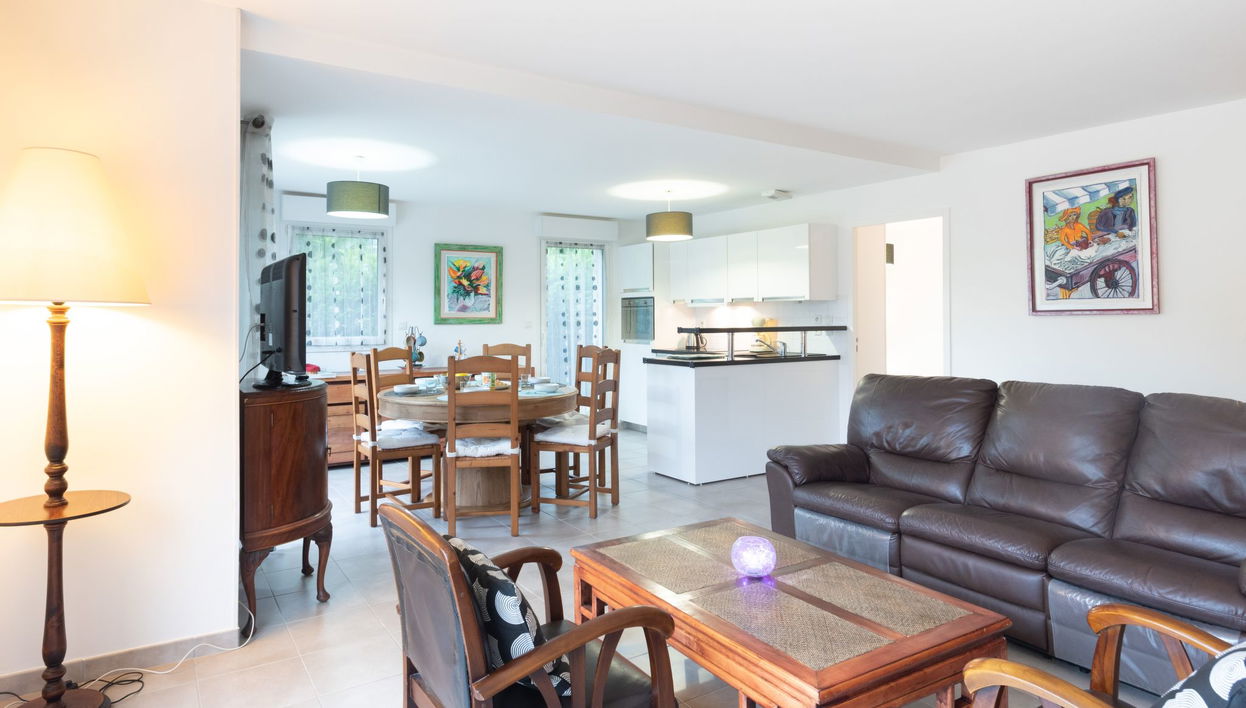 "Les Jardins du Levant", casa adosada 4 estancias 100 m2 en 2 plantas. Con mobiliario bonito: salón-comedor con TV (pantalla plana). Salida a la terraza, a la terraza-jardín. 1 dorm. con 1 cama de matrimonio (1 x 140 cm, 90 cm de longitud).