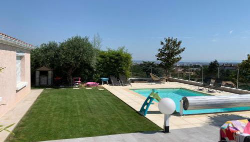 Villa 6 chambres avec piscine et vue exceptionnelle, que tiene piscina de temporada al aire libre, jardín y terraza, dispone de alojamiento en Saint-Genis-Laval con wifi gratis y vistas a la ciudad.
