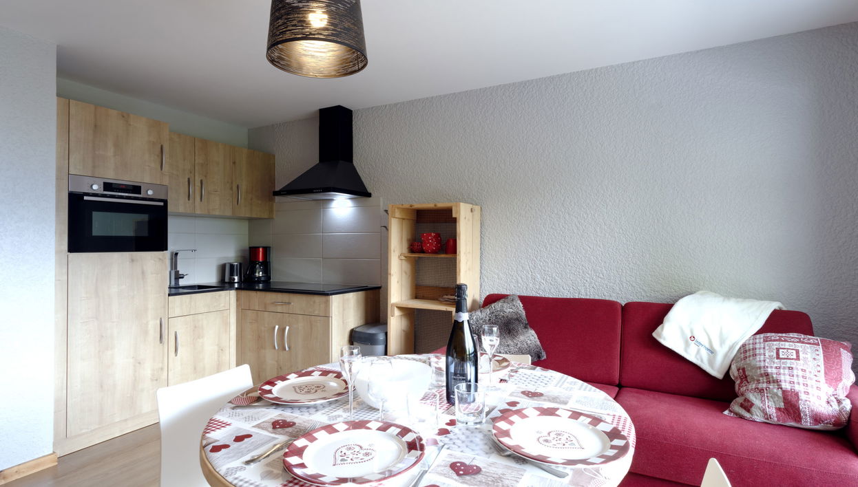 "Les Tétras" estudio 27 m2 en el 1° piso. Vivienda adecuada para 2 adultos + 2 niños. Con mobiliario bonito: salón-comedor con 1 sofá-cama doble (160 cm, 200 cm de longitud), TV (pantalla plana). Salida al balcón.