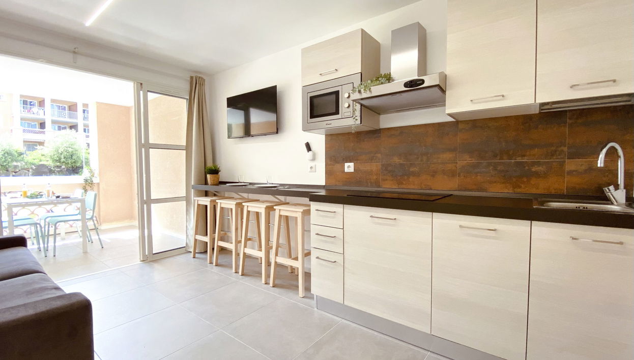 "L'Esquinade (J2 206)" estudio 24 m2 en el 1° piso. Vivienda adecuada para 2 adultos + 2 niños. Salón con 1 sofá-cama doble (140 cm, 190 cm de longitud), TV (pantalla plana). Salida a la terraza. Cabina con 1 x 2 literas (80 cm, 190 cm de longitud).