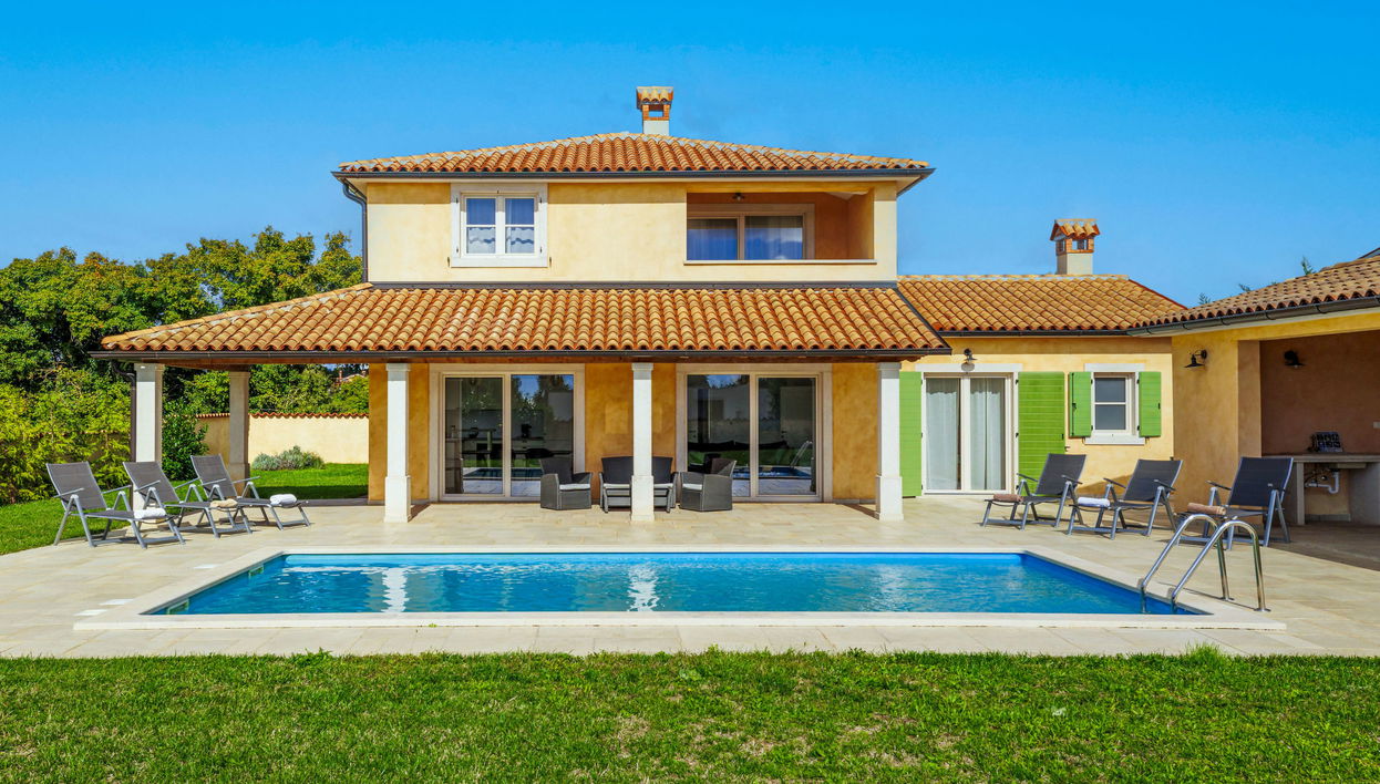 Villa "Flori", de 2 plantas del año 2019. A 300 m del centro de Svetvinčenat, lugar tranquilo, soleado, a 20 km del mar. Privado: terreno 1'080 m2 (vallada), jardín con césped y plantas, piscina rectangular (8 x 4 m, 36 m2, 150 cm de profundidad, Disponible por temporada: 01.May. - 30.Sep.). WC en zona de piscina, ducha exterior, terraza (35 m2), muebles de jardín, barbacoa. En el inmueble: acceso a internet, lavadora. Acceso hasta la casa (100 m camino de tierra). Aparcamiento (para 4 coches) junto a la casa en el mismo terreno. Tienda, supermercado, restaurante 300 m, parada autobús 1.1 km, playa de gravilla 20 km. Centro ecuestre 15 km, rutas de senderismo desde la casa 50 m, caminos para bicicletas 100 m. Atracciones en los alrededores: adventure park 13 km, amusement park 3.5 km. Los grupos de jóvenes deberán dejar el doble de fianza.