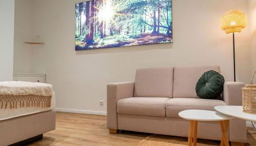 Este apartamento cuenta con 1 dormitorio, cocina con nevera y lavavajillas, TV, zona de estar y 1 baño.