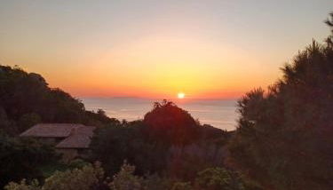 Villa La Lecceta surrounded by greenery and sea view with sunset