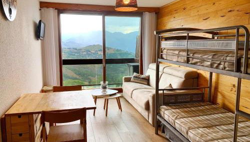 El apartamento cuenta con balcón y vistas a la montaña, y tiene 1 dormitorio, una sala de estar, TV de pantalla plana, una cocina equipada con nevera y horno, y 1 baño con bañera de hidromasaje.