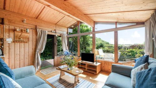 Scandinavian Style Lodge in Rock, que tiene jardín, terraza y zona de barbacoa, ofrece alojamiento en Wadebridge con wifi gratis y vistas al jardín.